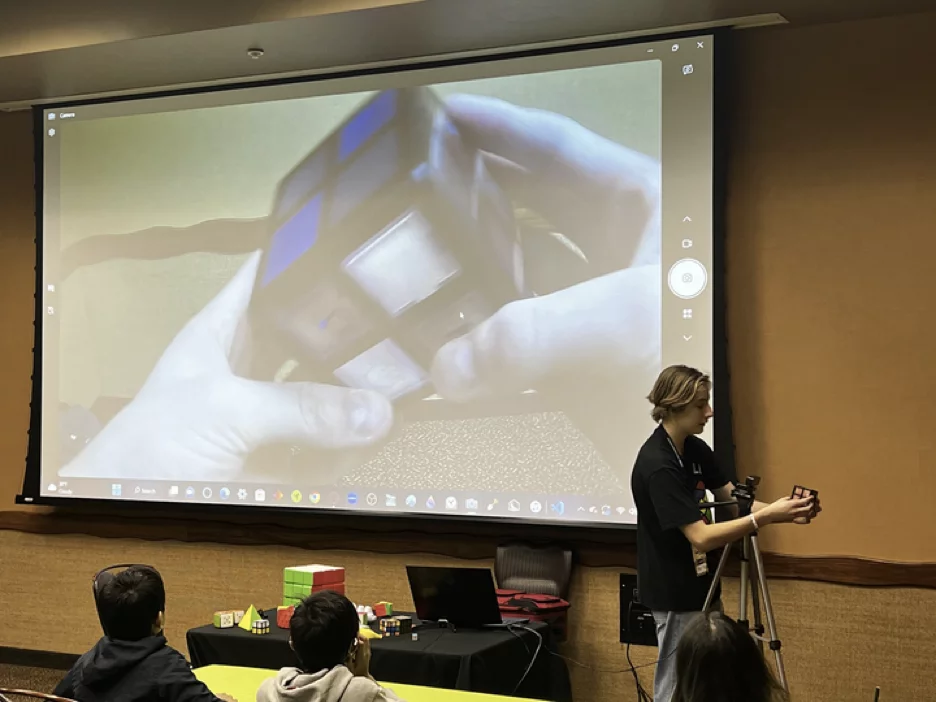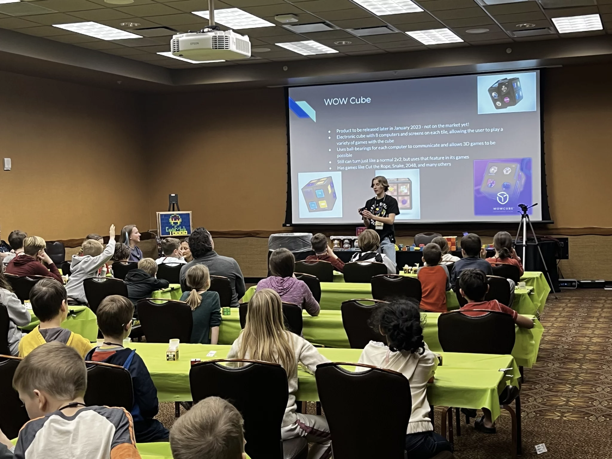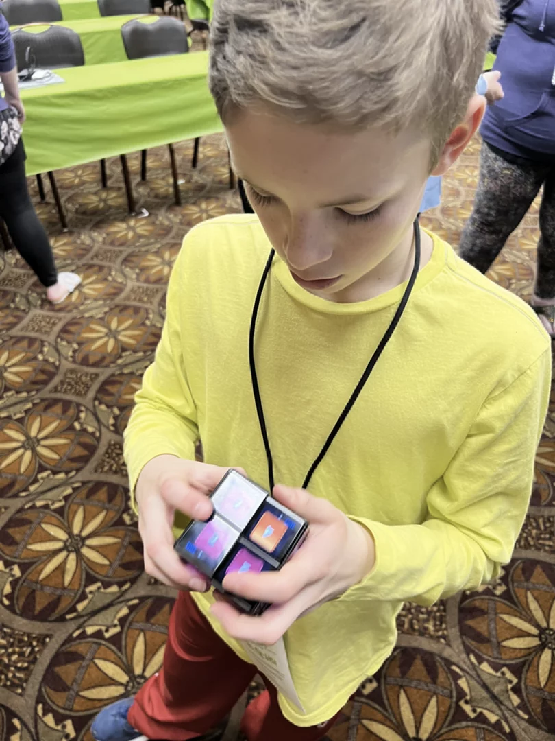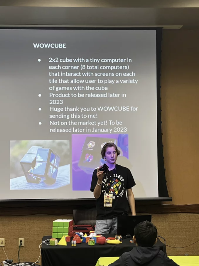 Ben provided both a general session for roughly 65 kids, and a ticketed deep dive session for teens and adults about various aspects of rubik’s cube algorithms. In both sessions, he demonstrated the WOWCube® System. He also allowed students and adults to play with the Cube at the end of each session.